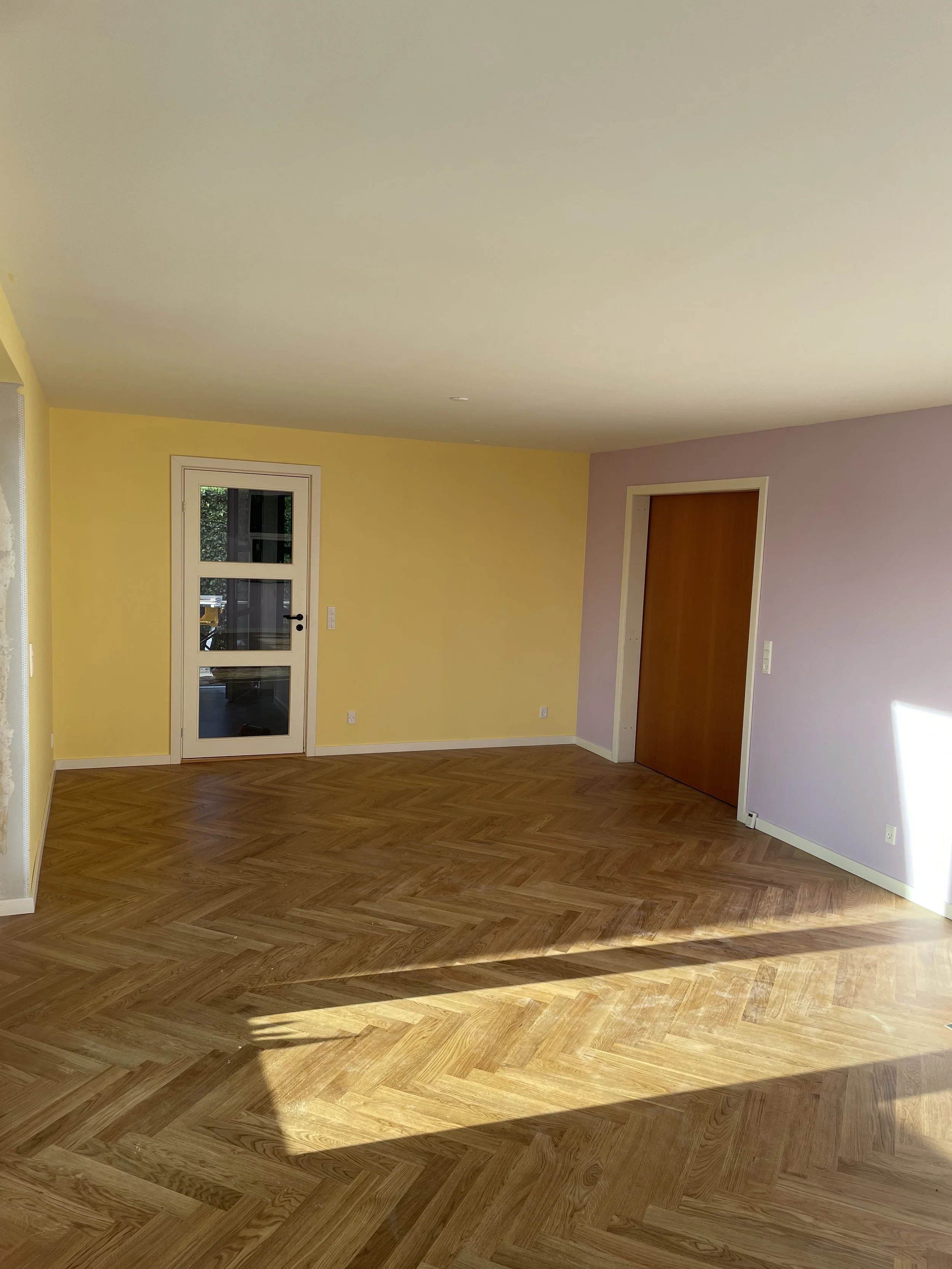 Stuen fremstår nu som et lyst, lækkert og indbydende rum – perfekt til både hverdag og gæster. Kombinationen af sildebensparket og gulvvarme giver både visuel elegance og en behagelig følelse året rundt.