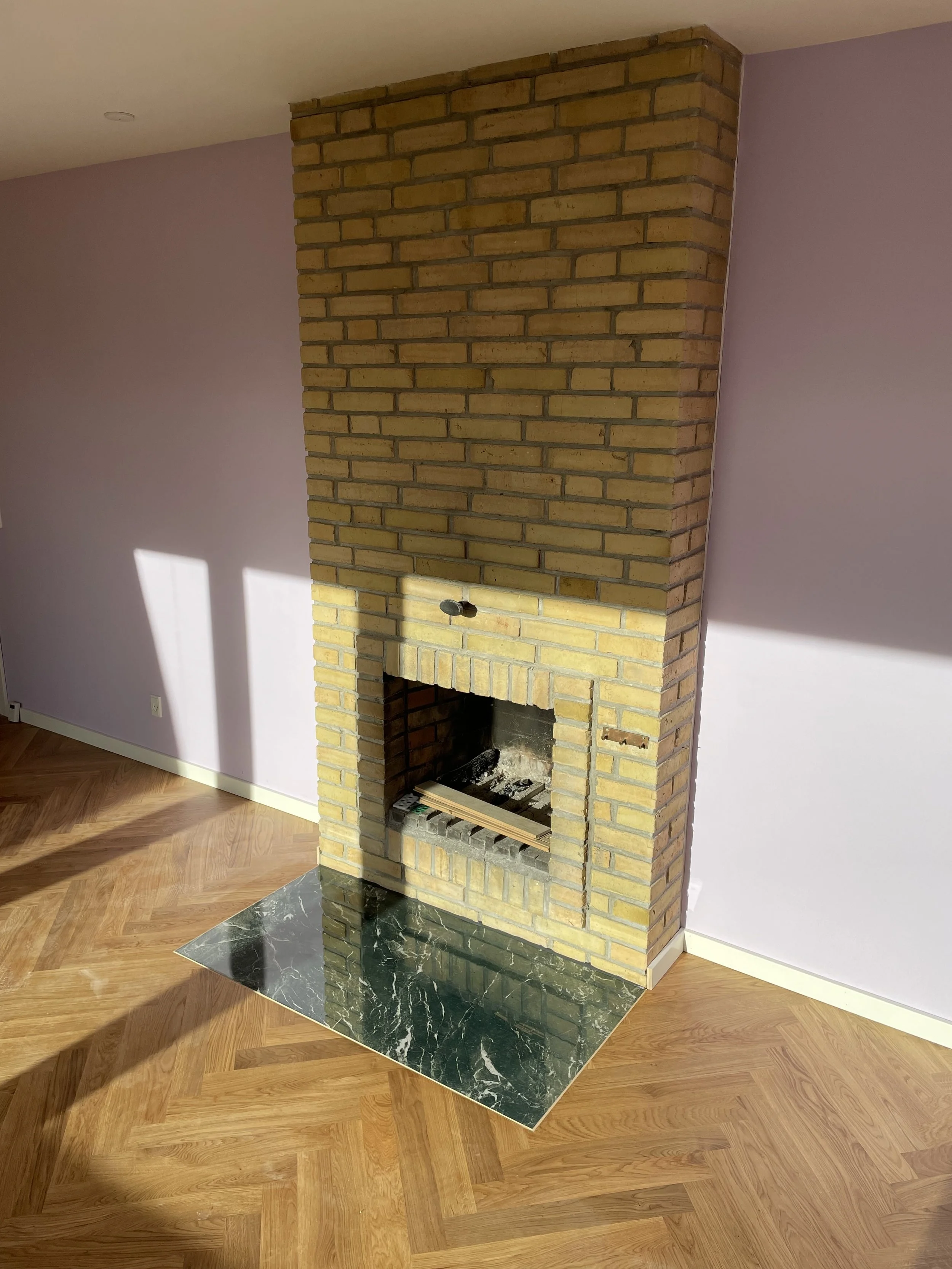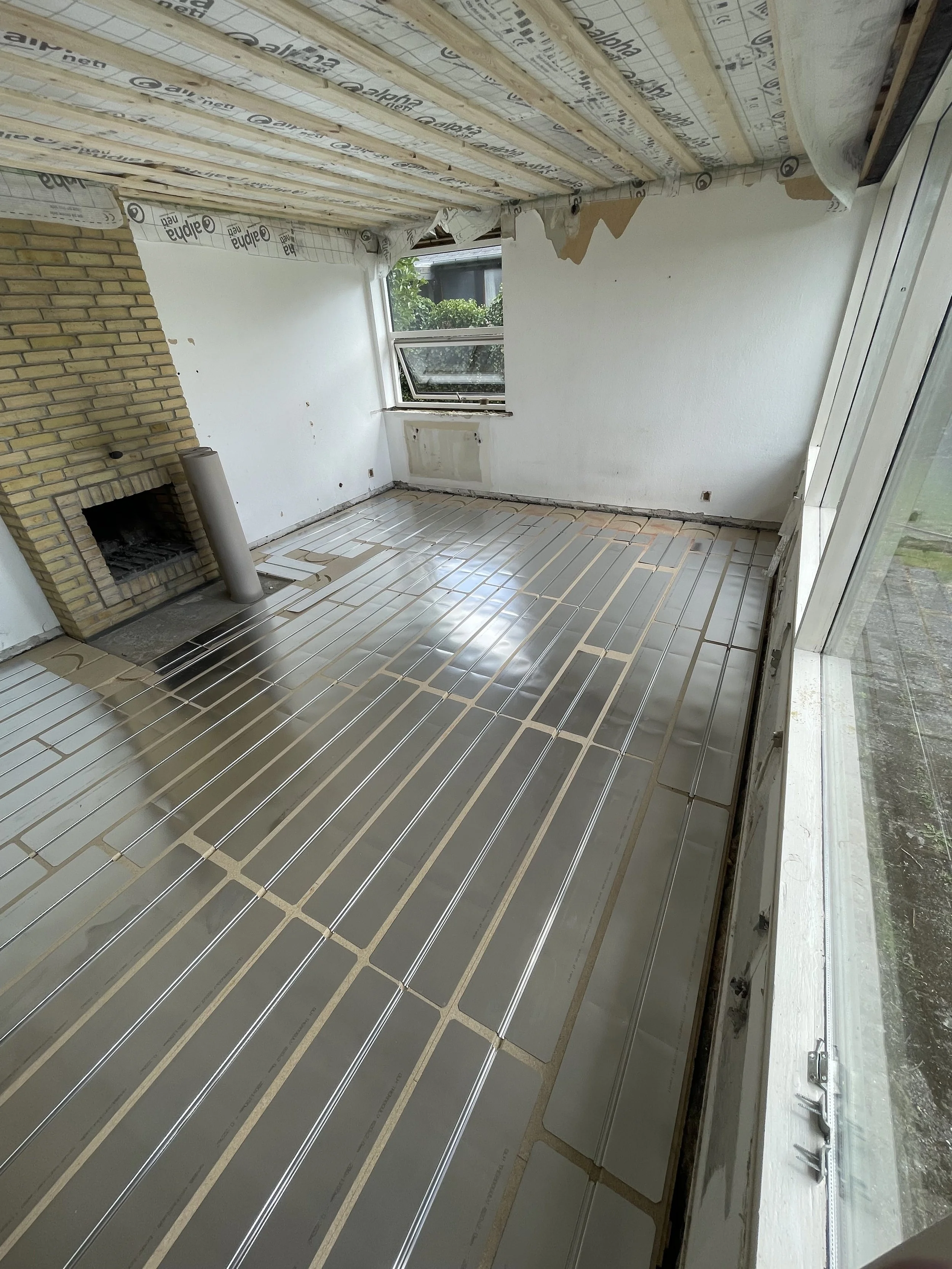 Der blev installeret moderne gulvvarmesystem – diskret og effektivt, så der nu er lun og behagelig varme i hele rummet uden synlige radiatorer.