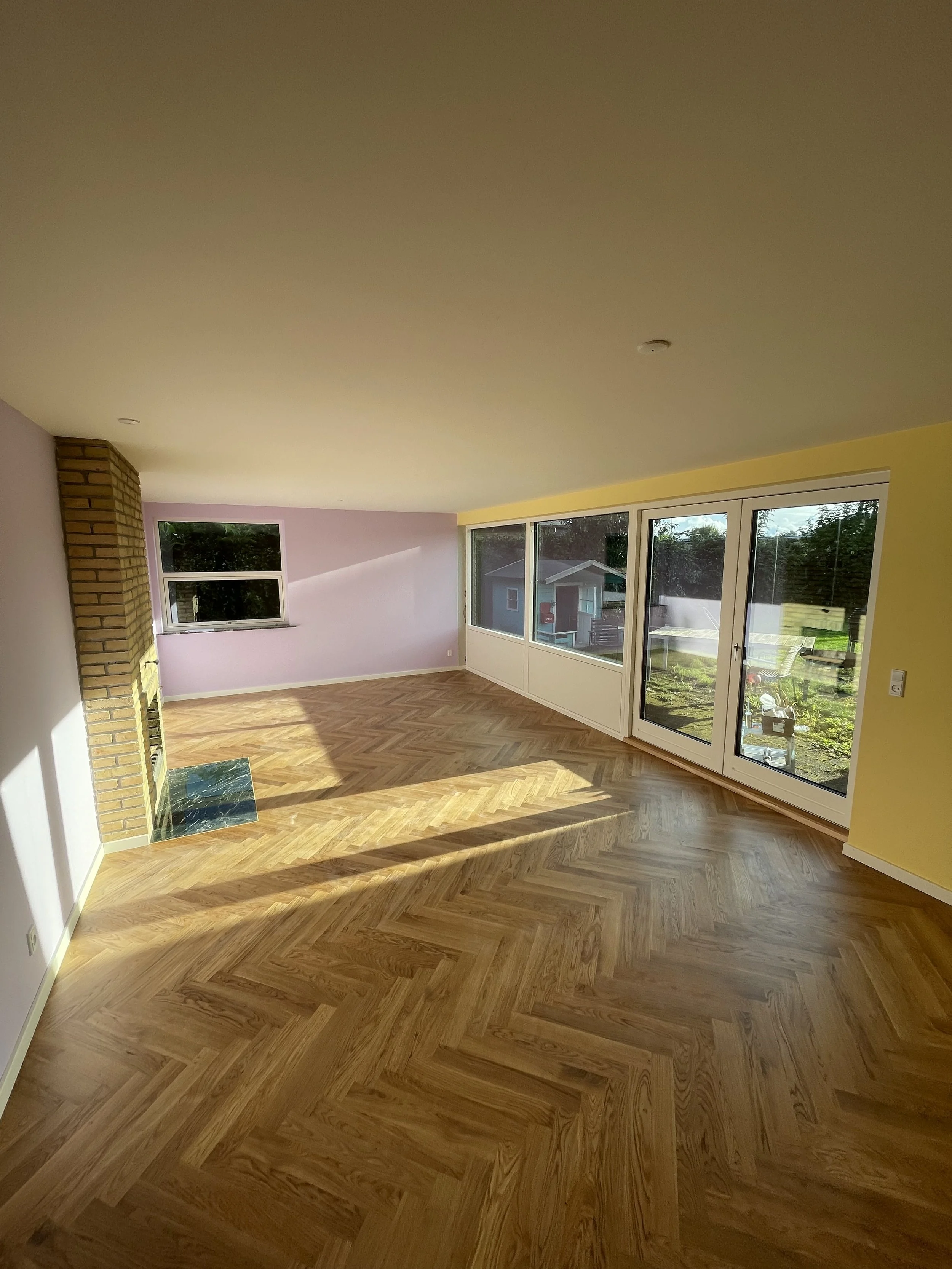 Som kronen på værket lagde vi smukt sildebensparket i eg – klassisk, tidløst og med en finish, der skaber varme og karakter i rummet. Hver stav blev nøje tilpasset og lagt med præcision.