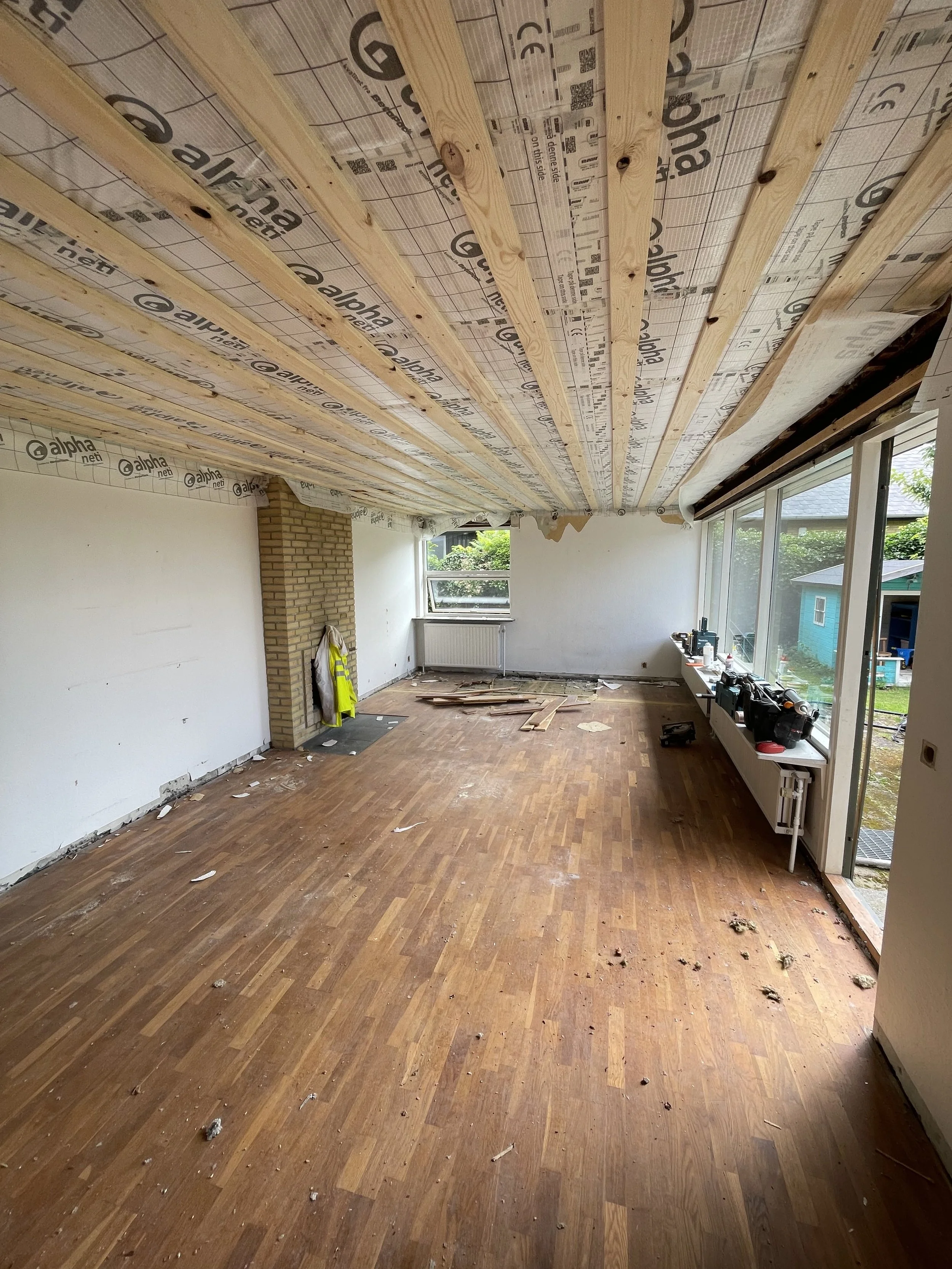 Vi fjernede det eksisterende gulv og lavede en komplet ny gulvkonstruktion med isolering og et gulvvarmesystem. Dette sikrer både stabilitet, godt energiforbrug og fremtidssikret komfort.