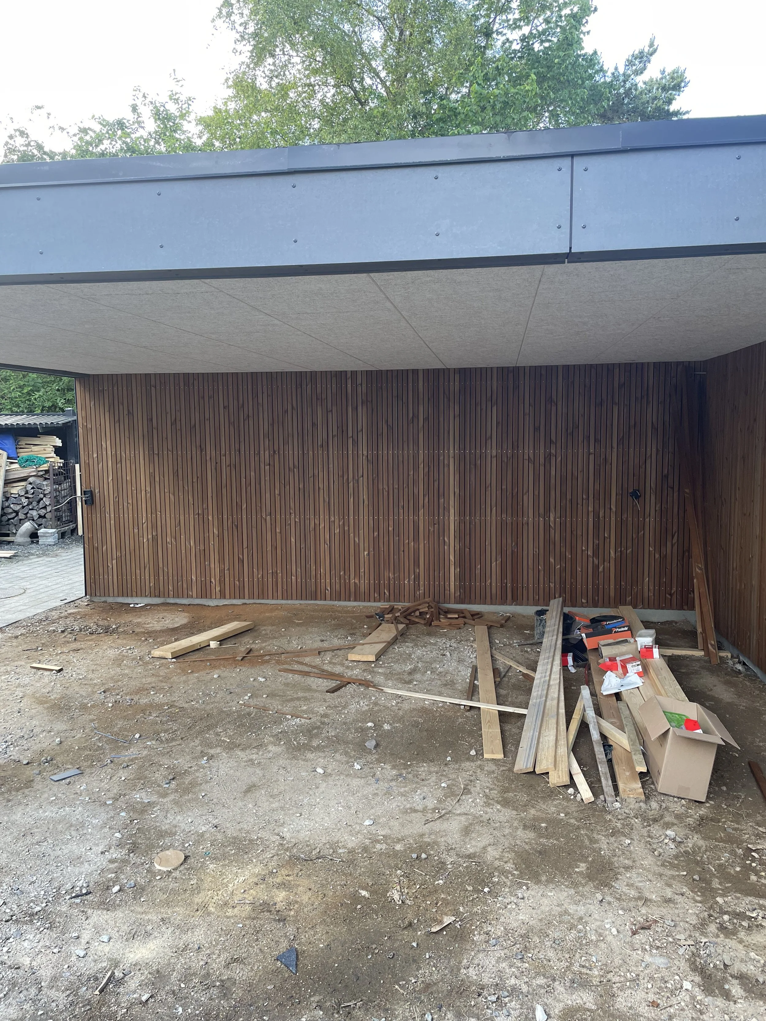 Vi opførte en solid og stilren carport i træ og beklædt i eternit og træ, med en tagkonstruktion dækket af tagpap – en holdbar og vedligeholdelsesvenlig løsning, der sikrer effektiv vandafledning og lang levetid.